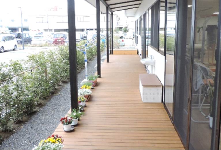 日当たりがよい全長20mのテラスは歩行訓練や日光浴にご利用いただけます。