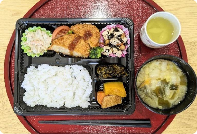 栄養バランスのよいおいしいおかずと温かいご飯、スープを提供しています。